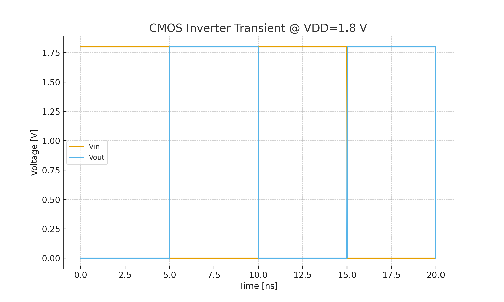 Minimal SPICE decks to observe CMOS inverter voltage transfer characteristics (VTC) and transient response.