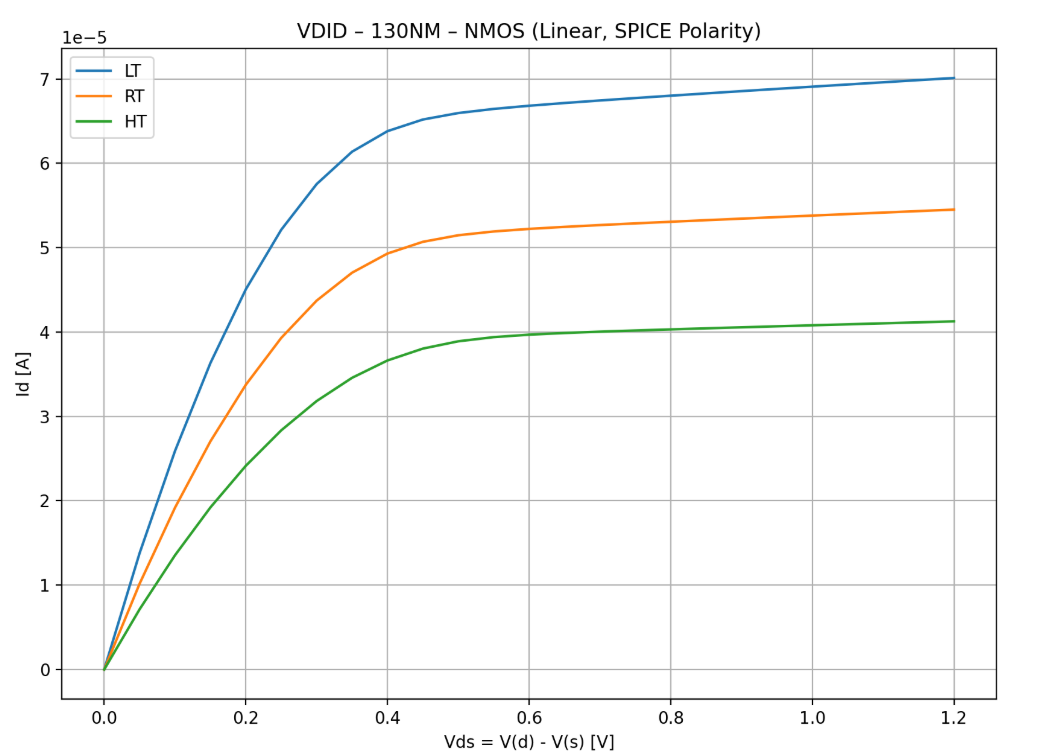 - β DC characteristics for NMOS/PMOS (130nm): VgβId (VGID) / VdβId (VDID)