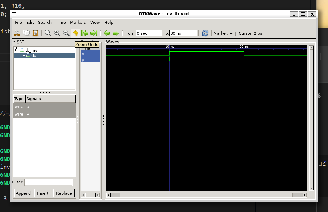 The following screenshot shows the inv_tb.vcd waveform displayed in GTKWave,