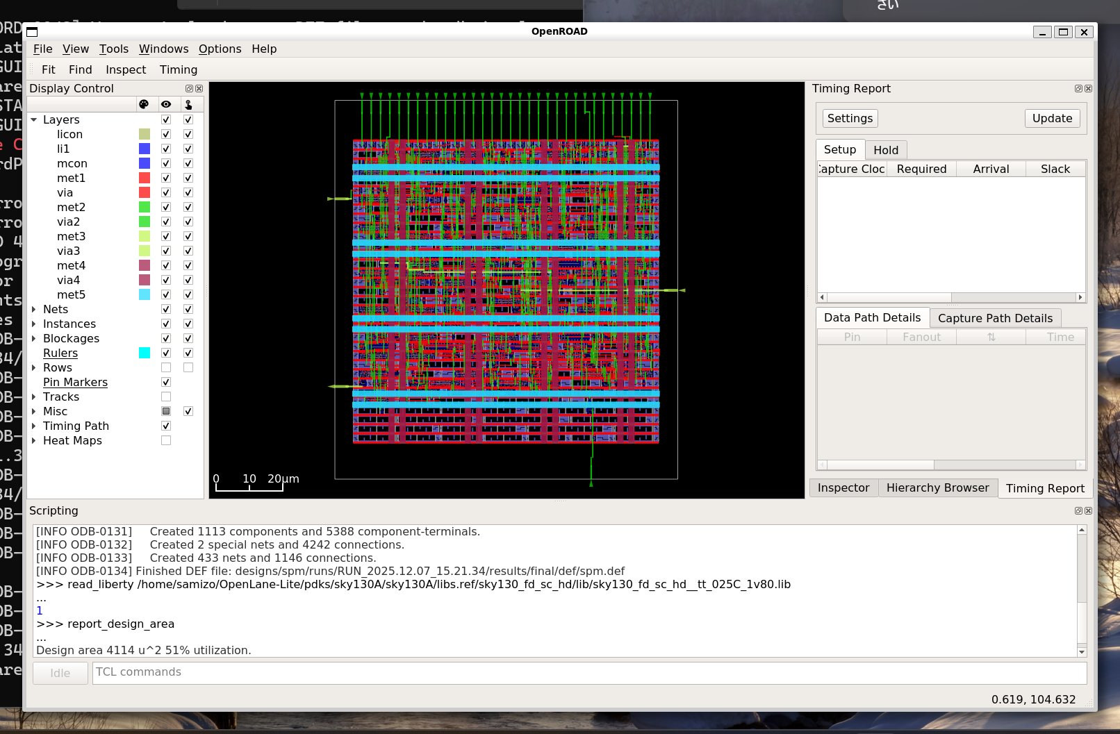 This directory documents a fully verified execution of OpenLane (superstable branch) using the example design SPM (Simple Processor Model).